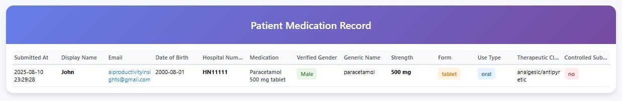 Integration with n8n: The verified data flows into the n8n workflow, ensuring that downstream steps—like GPT-5 classification and Google Sheets logging—are anchored to validated patient information.