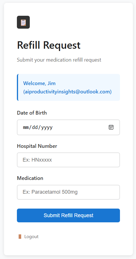 app.py).Refill form that captures Date of Birth (DOB), Hospital Number (HN), and Medication details (