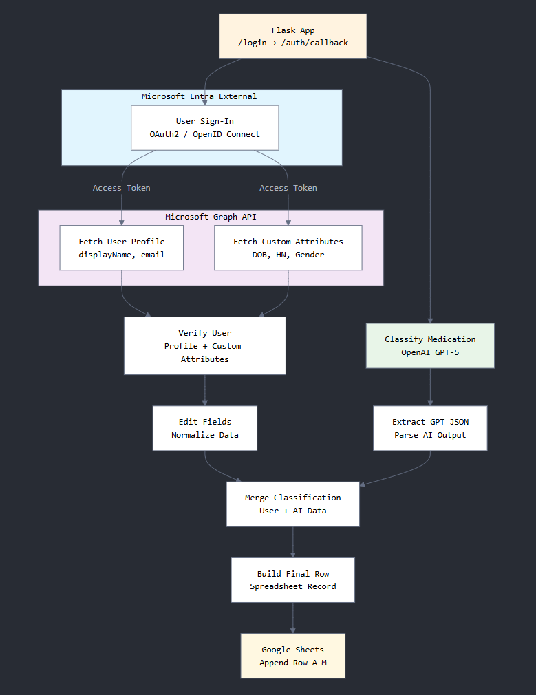 This section provides a comprehensive, step-by-step walkthrough of building a sophisticated Medication Refill Automation system that leverages multiple technologies: Microsoft Entra External ID for secure patient authentication, n8n for streamlined workflow automation, the advanced OpenAI GPT-5 Model for intelligent medication classification, and Google Sheets for efficient data storage and retrieval. We'll explore each component in detail, showing exactly how they integrate to create a seamless patient experience while maintaining security and compliance standards.