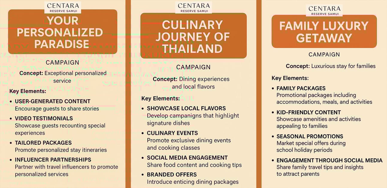 Figure 3: Example of three marketing campaigns to promote Koh Samui luxury stays to international travelers from the aggregated sentiment and topic data on Centara Reserve Samui