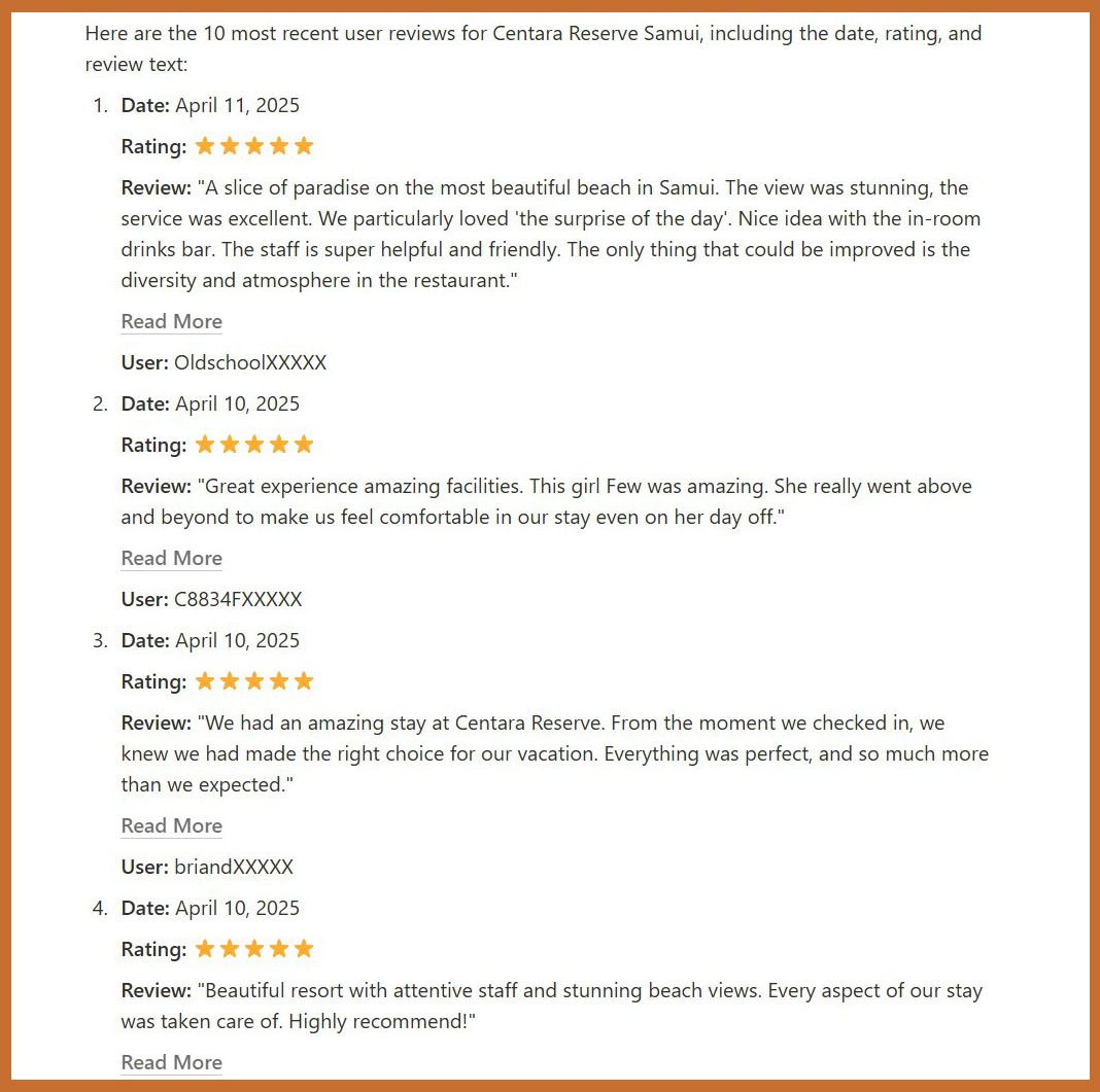 Figure 4: Recent user reviews for Centara Reserve Samui, including the date, rating, and review text